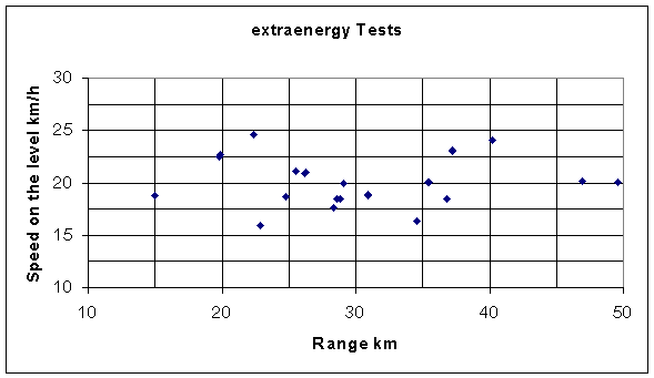 A detailed description of these tests appears in ExtraEnergy's test reports [1] and [2]. Both trial series took place in realistic field conditions with many different riders. The tests were conducted both on mainly level and on mainly constant slope courses. On a "mixed track" portion of the testing, the riders stopped several times to simulate red lights. The distance vehicles were able to travel (range) was determined by riding until the batteries were considered discharged.
