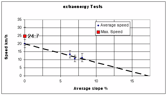 Average speed on the level is about 20 km/h (all samples), the maximum average speed 24.7 km/h (Velocity Dolphin). [Personal experience with the Dolphin also shows a much flatter curve. Ed.]