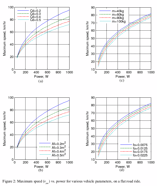 In Figure 3, if the air drag coefficient, frontal area, and rolling resistance coefficient are low as in Part (d), a 60-kg racercan reach 90 km/h on a flat road and 30 km/h on a 9 %-uphill gradient with [given sufficient duration] 500 W power. For the higher resistance values in Part(a), the maximum speed is 58 km/h on a flat road and 18 km/h on a 9 % uphill-gradient.
